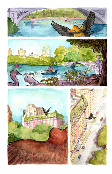 A Red-Tailed Hawk hunts an Orchard Oriole through New York’s Central Park in this hand-painted watercolor short story.